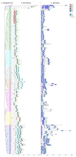 Phylogenetic relationship, conserved motifs and gene structure of AsWRKY proteins in oat. (A) The phylogenetic tree was constructed based on 162 AsWRKY full-length proteins using MEGA 7 software. (B) The conserved motifs, numbers 1–10, are shown in different colored boxes. The details of each motif provided by Figure S2. (C) The exon-intron structure of AsWRKY genes. Grey boxes represent 5′ UTR and 3′ UTR, blue boxes represent exons, greens boxes represent AsWRKY genes, and black lines present introns.