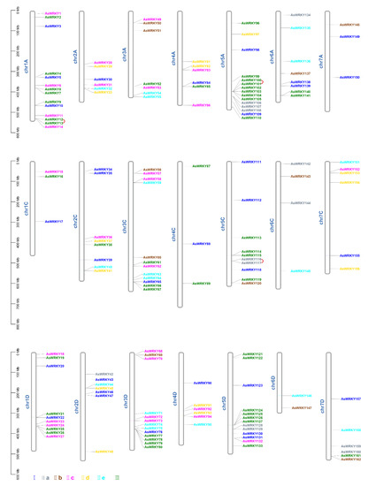 To further analyze the chromosomal distribution of AsWRKY genes, we mapped all genes based on the available gene annotation information in oat (Figure 4, Table S5). The results showed that 162 genes could be mapped to 21 oat chromosomes, and the number of genes in the A, C, and D subgenomes (59, 46, and 57) did not significantly differ overall–but this was not the case for individual chromosomes. Among these, 5A (15, 9.26%), 1A (14, 8.64%), 3D (13, 8.07%), and 5D (13, 8.07%) showed relatively greater numbers distribution. In contrast, 6D has the lowest number distribution of genes (2, 1.23%), and interestingly 6D was also the shortest chromosome among them. Moreover, gene density was not positively correlated to the number of chromosomes, with AsWRKY gene density ranging from 0.004/Mb (4C) to 0.031/Mb (5A) (Figure S3).