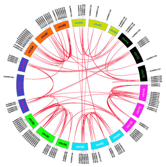 Synteny analysis of AsWRKY genes in oat. The red lines represent segmental duplication gene pairs. Chromosomes 1–7 are shown in different colors.