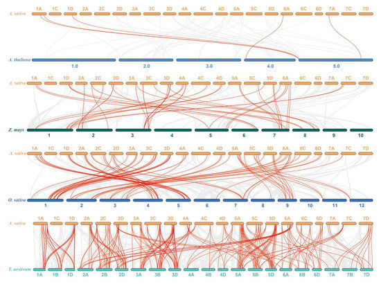 Synteny analysis of AsWRKY genes between oat and five representative plant species. The gray lines show colinear blocks in the genomes of oat with other plants, while the red line highlights the colinear WRKY pairs. The species name with the prefixes ‘A. sativa’, ‘A. thaliana’, ‘Z. mays’, ‘O. sativa’ and ‘T. aestivum’ indicate Avena sativa, Arabidopsis thaliana, Zea mays, Oryza sativa, and Triticum aestivum, respectively.