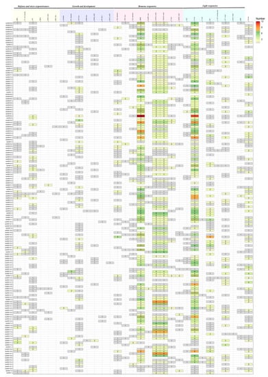 - Lescot, M.; Déhais, P.; Thijs, G.; Marchal, K.; Moreau, Y.; van de Peer, Y.; Rouzé, P.; Rombauts, S. PlantCARE, a database of plant cis-acting regulatory elements and a portal to tools for in silico analysis of promoter sequences. Nucleic Acids Res. 2002, 30, 325–327. [Google Scholar] [CrossRef] [PubMed]