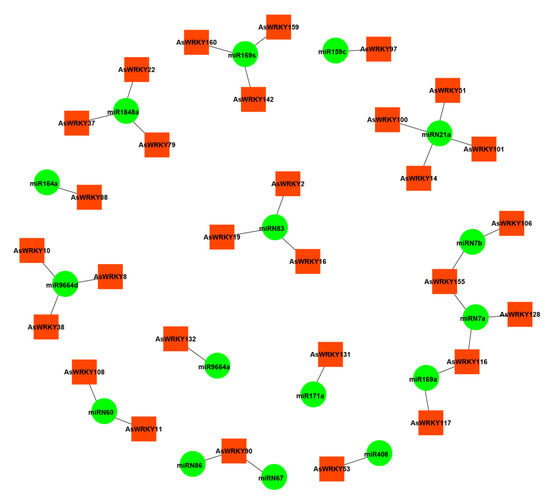 miRNA can directly bind to TFs and regulate the expression of genes [66]. At the post-transcriptional level, miRNAs can regulate the expression of various WRKY TFs to regulate various processes [67]. Therefore, the interaction miRNA of AsWRKY genes were predicted by a strict parameter, a total of 29 AsWRKYs were targeted by 16 miRNAs (Figure 8 and Table S9). Two members of the miR169 family target five genes (AsWRKY116, AsWRKY117, AsWRKY142, AsWRKY159, and AsWRKY160). Two members of the miR664 family target four genes (AsWRKY132, AsWRKY10, AsWRKY38, and AsWRKY8), and the miRN7 family also targets four genes (AsWRKY116, AsWRKY128, AsWRKY155, and AsWRKY106). Another known and novel miRNA targets one or multiple genes. The regulation function of the miRNAs in the WRKY family needs additional research to explain.