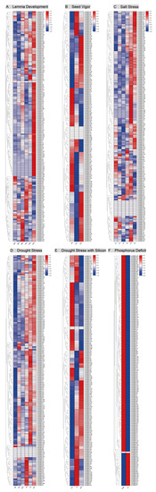 In this study, data SRP294982, SRP235083, SRP094911, SRP094513, and SRP237902 from NCBI (https://www.ncbi.nlm.nih.gov/sra/?term=oat) (accessed on 15 March 2022) were analyzed with Kallisto [60], and the AsWRKY gene expression profiles were calculated under lemma development, seed vigor, salt stress, phosphorus deficiency, and drought conditions [61,62,63]. In addition, we also analyzed transcriptome data under different drought conditions from our previous study. Transcripts per million (TPM) was used to calculate the gene expression and heat maps were produced using TBtools software [53].