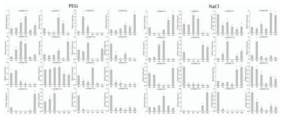 To explore the expression levels of AsWRKY genes under different abiotic stresses (drought and salt), qRT-PCR analysis was performed on 16 genes from AsWRKY members. Overall, some AsWRKY genes were significantly inhibited by PEG or salt treatment (Figure 10). For example, AsWRKY83/161/156/53 responded to PEG and AsWRKY161/156/36/53 to salt. In addition, when multiple AcWRKY genes were induced by the same treatment, their expression levels increased or decreased with the increase of time, which could be summarized as early and late expressed genes. For example, AsWRKY10/65/72/84/5/76/22/94/152/119 responsed to drought stress, and AsWRKY10/84/65/72/4/152 76/5/9/119/24/83 to salt stress.