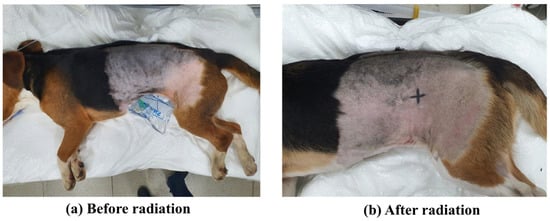 The healthy dogs were given a total dosage of 48 Gy in 12 portions of 4 Gy per day for 12 days at the left trunk skin. After radiation therapy, the dog’s skin was observed immediately (Figure 1). During radiation therapy for 12 days, there were no notable changes in the skin tissue stimulated by radiation except faint erythema.