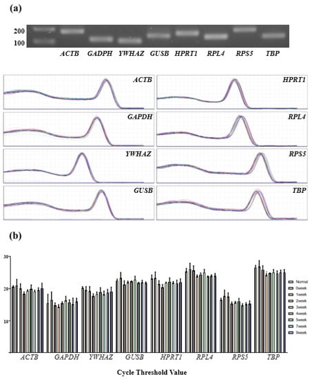 For the analysis of the melting curve in this study, each reference gene amplification was demonstrated by a single product without any hairpin and dimers amplification due to a single peak melting curve. In addition, the gel electrophoresis of amplicons was shown an expected product size without nonspecific amplification, such as hairpin, self-dimer, and heterodimer (Figure 2a). In addition, the primer efficiency was tested using a four-fold serial dilution of cDNA, which produced 0.97–1.03 PCR efficiencies (E) and a 0.991–0.997 correlation coefficient (R2), implying that the eight candidate reference gene primers were suitable for qRT-PCR (Table 1). To estimate the mRNA transcription level for each sample, all reference gene Ct values were evaluated, as shown in Figure 2b. After exposure to radiation, each week’s sample showed a different Ct value. The Ct value of TBP at 2 weeks was significantly (p < 0.05) different.