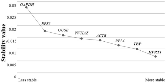 During the evaluation of the reference gene stability, the factors such as the size of the primer and amplicon can have an impact on the reference gene stability [16]. Therefore, in the present study, primers with amplicon size between 100 and 200 were used to avoid additional effects on the reference gene stability. As a result, geNorm and Normfinder are most commonly used in several reports for reference gene analysis studies [30,31]. In this study, the analysis results of geNorm and Normfinder were almost similar, and these two algorithms suggested TBP, HPRT1 and RPL4 as the most stable reference genes. On the other hand, HPRT1 was found to be the most stable reference gene considering all three algorithms; the different ranking of reference genes in Bestkeeper is possibly generated by a different algorithm than other two algorithms [31,32].