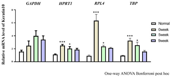 In our results, the most stable reference gene HPRT1, and the most unstable reference gene GAPDH were suggested by the analysis of three algorithms (Table 3). Reference gene was used for the normalization of Keratin 10 gene, a common epidermal marker in each group of the post-irradiation canine tissues (Figure 5). When HPRT1, RPL4, TBP and GAPDH were used for normalization, the expression of Keratin 10 was changed in each sample after radiation exposure every week (Figure 5). The stable reference gene used for normalization of Keratin 10 expression showed significantly upregulated expression at 0 week and 5th week compared to the normal tissue. However, in the case of GAPDH, no significant difference in Keratin 10 expression was observed in all the samples every week after irradiation. In addition, Keratin 10 expression was highly increased at 0 week using HPRT1.