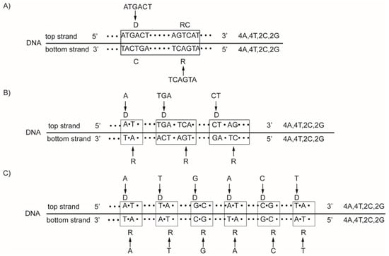 Examples for the natural symmetry law of DNA creation and conservation. According to this law, all mono/oligonucleotides which enter one strand of DNA must enter the second strand regardless of their localization. (A) Example with the entrance of a 6 nt oligonucleotide, ATGACT, into the top strand, reading its reverse oligonucleotide TCAGTA unidirectionally or reading the direct form of ATGACT bidirectionally (5′3′↔3′5′), entering the bottom strand. Thus, mirror symmetry between both strands is created. Due to Watson–Crick pairing and mirror symmetry, the quadruplet structures are formed, automatically fulfilling CSPR: fD = fRC. (B) The same nucleotides may also enter as mononucleotide (A), trinucleotide (TGA) and dinucleotide (CT). The farther process and result are identical, as in A. (C) The same 6 nucleotides can enter the top strand and the bottom strand individually as mononucleotides. Binding with a complementary pair, the quadruplet structures are created, and the final CSPR result is identical, as in cases A and B. It can be seen how the bidirectional DNA structure is formed: AT(D) in the top strand and TA(R) in the bottom strand, or GC(D) in the top strand and CG(R) in the bottom strand.