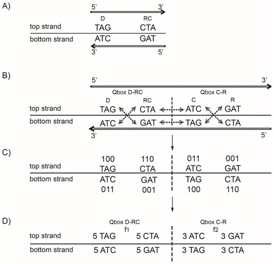 The difference between strand symmetry and quadruplet symmetry for triplets. (A) Strand symmetry includes in the same strand of only the direct (D) and reverse complement (RC) of a triplet. Reading bidirectionally, as pointed by the direction of the arrow, the same trinucleotides appear in both strands. Therefore, only one strand is considered in the determination of strand symmetry (the top strand). Thus, the DNA is reduced to a binary system. However, in this way, symmetries among trinucleotides are not evident. (B) Quadruplet symmetry includes the whole quadruplet of trinucleotides: direct (D), reverse complement (RC) as well as the complement (C) and reverse (R) in both strands of DNA. The quadruplet boxes QboxD-R and QboxC-R are created with mirror symmetries between the strands and between the boxes. Thus, each quadruplet consists of structural symmetries, creating an esthetical form of “butterfly” mirror symmetry, and the DNA is reduced to a quartic system. (C) The same quadruplet mirror symmetries are present in the purine–pyrimidine relationship: 0 is assigned to purines (A, G), and 1 is assigned to pyrimidines (T, C). (D) All members of the same box have the same frequencies (fD = fRC, respectively, fC = fR), but frequencies between the boxes mutually differ. For quadruplets with symmetric trinucleotides, such as AGA or CTC, there is no difference in frequencies between boxes. However, frequencies in both strands of DNA for each individual quadruplet are identical regardless of whether the trinucleotides are symmetric or asymmetric (fD = fRC = fC = fR), such as in our example: (D) 5 TAG (top strand) + 3 TAG (bottom strand) = 8 TAG; (RC) 5 CTA (top strand) + 3 CTA (bottom strand) = 8 CTA; (C) 5 ATC (bottom strand) + 3 ATC (top strand) = 8 ATC; and (R) 5 GAT (bottom strand) + 3 GAT (top strand) = 8 GAT.