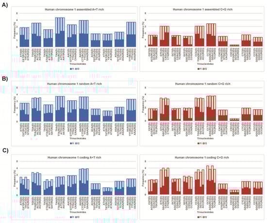 The following supporting information can be downloaded at: https://www.mdpi.com/article/10.3390/genes13111929/s1, Table S1: Relative frequencies for A–T and G–C base pairs from human chromosomes; Table S2: Relative frequencies of complementary A–T and C–G base pairs from 200,000 bp concatenated sequence; Table S3: Relative frequencies of complementary A–T and C–G base pairs from coding DNA in human chromosomes; Table S4: Relative frequencies of complementary A–T and C–G base pairs from NBPF genes including introns in human chromosomes; Table S5: Relative frequencies of complementary A–T and C–G base pairs from NBPF introns in human chromosomes; Table S6: Relative frequencies of complementary A–T and C–G base pairs from exons in NBPF genes; Table S7a: Relative frequencies of trinucleotides in all 20 quadruplets in the whole human chromosome 1; Table S7b: Relative frequencies of trinucleotides of all 20 quadruplets for a sequence of 200,000 bp formed of randomly selected subsequence from human chromosome 1; Table S7c: Relative frequencies of trinucleotides of all 20 quadruplets for coding DNA from human chromosome 1; Table S8: Coding and noncoding DNA in some symbionts; Table S9: A–T rich and C–G rich quadruplet matrices from each of human chromosome, 200,000-bp random sequence and coding DNA of each human chromosome; Table S10: A–T rich and C–G rich quadruplet matrices from each NBPF gene, introns and exons from NBPF genes.