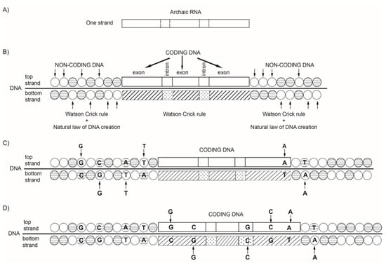 Novel hypothesis of DNA creation. (A) Single strand archaic RNA, being short, fragile and without symmetries and with the absence of CSPR, had limited evolutionary potential. (B) Double-stranded DNA originated by binding archaic RNA with its complementary nucleotides, creating pairs A→T, C→G according to the Watson Crick rule, giving rise to the double helix of coding DNA. It was initially also symmetry-free, with the absence of CSPR. Simultaneously, besides the Watson–Crick rule, there appeared a new insertion of nucleotides according to the natural symmetry law of DNA creation and conservation; the same nucleotides entered both strands, regardless of localization. This led to the creation of noncoding DNA with quadruplet mirror symmetries. (C) As a result of the new principle of creation based on the natural symmetry law of DNA creation and conservation, noncoding DNA grows much faster, and thus, the new insertions are induced. If an additional insertion enters a segment on one strand of coding DNA, it contributes to its enlargement but without creating new symmetries. On the other hand, the same insertion into the long noncoding part of the DNA does not essentially violate its symmetries. (D) Insertion into one strand of an exon, and according to the natural symmetry law of DNA creation and conservation, the accompanying insertion into the opposite strand but in the position of an intron does not create symmetries and CSPR for coding DNA. If the same insertions enter both strands of the exon, they do not lead to symmetries and CSPR because they do not compensate symmetry-free archaic DNA built into the DNA molecule. In summary, insertions, as rare events, cannot violate symmetries in large noncoding DNA because of the natural symmetry law of DNA creation and conservation, and insertions (mutations) in much smaller coding DNA cannot create symmetries because of built-in symmetry-free archaic RNA. However, viewing the whole DNA molecule, regardless of whether an insertion enters the coding or noncoding part, due to the natural symmetry law of DNA creation and conservation, the same insertions always enter both strands, and thus, its growth fully supports CSPR. In this way, quadruplets, as basic building elements with mirror symmetries, gave the DNA molecule strong evolutionary potential.