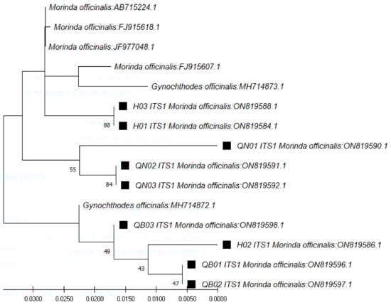 In the case of ITS1 region sequences (~179 bp), through use of the ITS1 pair of primers (ITS 5a forward and 4 reverse) and the BLAST tool for identification, the closest species was found to be M. officinalis, at 98.88% similarity (Table 3). The phylogenetic tree for those sequences was constructed with the closest species (Figure 2). In the case of the ITS2 region sequences (~235 bp), through use of the ITS2 pair of primers (ITS S2F and ITS S3R), the closest species was found to be Gynochthodes officinalis (synonym of M. officinalis), at 100% similarity (Table 4). The phylogenetic tree for those sequences was constructed with the closest species (Figure 3).