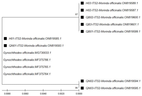A total of 27 assembled sequences were obtained and deposited in the GenBank: nine assembled sequences of ITS1 amplicon, nine assembled sequences of ITS2 amplicon, four assembled sequences of matK amplicon, and five assembled sequences of rbcL amplicon. The BLAST tool was used to identify the plant for each sequence, and the closest species in the GenBank was obtained. The results showed that all markers used and plants deposited in this study belonged to the genus Morinda. Gynochthodes officinalis (synonym of M. officinalis) was the most closely related species, with a higher extent than other species of the Morinda genus.