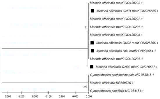 In the case of the matK region sequences (ranging from 861 bp to 899 bp), through use of the matK pair of primers (390F and 1326R), the closest species was found to be M. officinalis, at 99.89% similarity (Table 5), followed by Gynochthodes parvifolia, at 99.78% similarity. The phylogenetic tree for these sequences was constructed with the closest species (Figure 4).