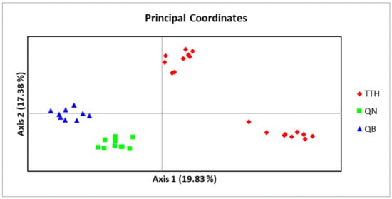 Principal coordinate analysis (PCoA) based on codominant genotypic distance for 37 studied samples of three populations of M. officinalis ( TTH: TTH population; QN: QN population; QB: QB population).