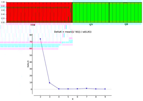 - Pritchard, J.K.; Stephens, M.; Donnelly, P. Inference of population structure using multilocus genotype data. Genetics 2000, 155, 945–959. [Google Scholar] [CrossRef]