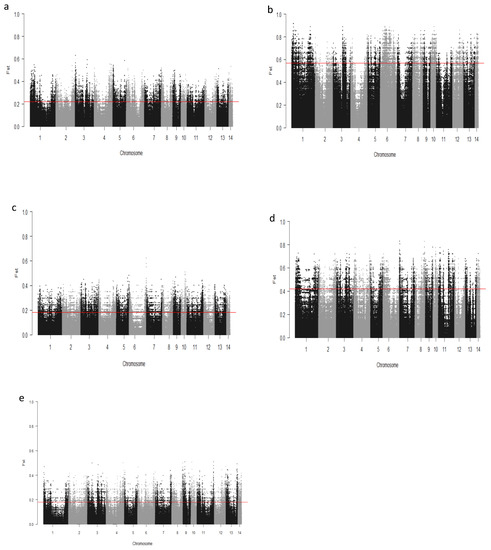 - Weir, B.S.; Cockerham, C.C. Estimating F-Statistics for the Analysis of Population Structure. Evolution 1984, 38, 1358–1370. [Google Scholar]