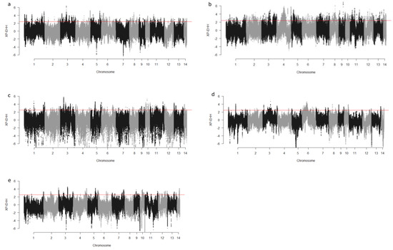 Genome-wide distribution of XP-EHH across chromosome regions in different groups of fur quality and coat color in American mink. The horizontal lines indicate the top 1% of values for each test across the entire genome. High positive values indicate the selection in short nap size (a), high overall fur quality (b), large skin size (c), pastel coat color (d), and stardust coat color (e).
