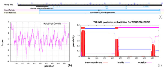 Physicochemical properties of Bx-cyp29A3. (a) Conserved domains search result of Bx-cyp29A3; (b) ProtScale analysis result of Bx-cyp29A3; (c) TMHMM server analysis result of Bx-cyp29A3.