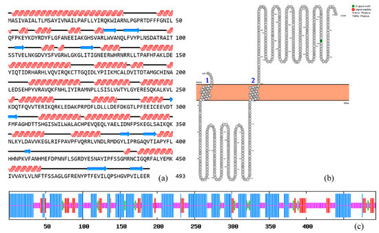Structural analysis of Bx-cyp29A3. (a) Protein secondary structure prediction based on position-specific scoring matrices of Bx-cyp29A3; (b) Topological analysis of Bx-cyp29A3. Numbers represent sites of transmembrane structures; (c). SOPMA—Protein secondary structure prediction peak, blue: Alpha helix; Green: Beta turn; Yellow: Random coil; Red: Extended strand.