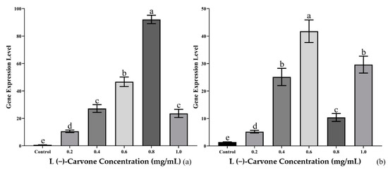 Gene expression of Bx-cyp29A3 treated with L(−)-carvone solutions. (a) 24 h treatment with L(−)-carvone solutions of 0.2, 0.4, 0.6, 0.8, and 1.0 mg/mL; (b) 36 h treatment with L(−)-carvone solutions of 0.2, 0.4, 0.6, 0.8, and 1.0 mg/mL. Notes: Data are mean values ± SD of different repetitions; n = 3. Different letters indicate statistical differences with p ≤ 0.05 from Student’s t-test.