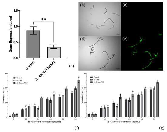 Bx-cyp29A3 silencing response to L(−)-carvone stress. (a) Relative transcript level changes between dsRNA-treated and control group; (b–e) FITC-treated PWNs revealed green fluorescent signal under ultraviolet light; (f) the mortality rates of PWNs after treatment with L(−)-carvone and exposed for 24 h; (g) the mortality rates of PWNs after treatment with L(−)-carvone and exposed for 36 h. Notes: Scale bar = 100 μm. Data are mean values ± SD of different repetitions; n = 3. ** p-Value ≤ 0.01; different letters indicate statistical differences, with p ≤ 0.05 from Student’s t-test.