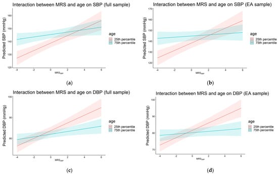 We observed significant interaction between MRSSBP and age in the full sample and EA, where the effects of MRSSBP decreased at older age (βinteraction = −1.19, p = 0.002 for the full sample and βinteraction = −1.85, p = 7.0 × 10−5 for EA). Panels (a) and (b) in Figure 2 show the predicted SBP by MRSSBP at the 25th and 75th percentile cutoff values of age for the full and EA samples. For the full sample, this was equivalent to 2.90 vs. 0.95 mmHg increases in SBP for each 1 SD in MRSSBP at age 65.0 (25th percentile) and 77.5 (75th percentile), respectively. In EA, the corresponding effect estimates of MRSSBP were 3.45 and 0.54 mmHg at age 64.0 (25th percentile) and 79.0 (75th percentile), respectively. We observed similar findings for MRSDBP and age (βinteraction = −0.74, p = 0.001 for the full sample and βinteraction = −1.16, p = 1.9 × 10−5 for EA (panels (c) and (d) in Figure 2). For the full sample, this was equivalent to 1.86 vs. 0.65 mmHg increase in DBP for each 1 SD increase in MRSDBP at age 65.0 (25th percentile) and 77.5 (75th percentile), respectively. In EA, the corresponding effect estimates of MRSDBP were 2.22 and 0.40 mmHg at age 64.0 (25th percentile) and 79.0 (75th percentile). We noted a similar trend in AA, where the effects of the MRSs decreased with age (βinteraction = −0.46 for MRSSBP and βinteraction = −0.48 for MRSDBP), but the associations did not reach statistical significance.