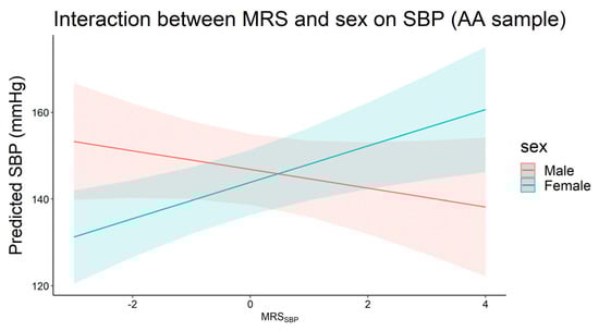 Plot of predicted systolic blood pressure by MRSSBP for males (n = 149) and females (n = 288) in the African ancestry sample (pinteraction < 0.05).