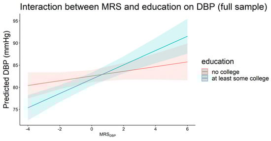 Plot of predicted diastolic blood pressure by MRSDBP for those with (n = 1582) and without (n = 1488) at least some college education in the full sample (pinteraction < 0.05).