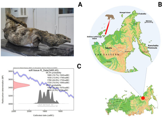 - Boeskorov, G.G.; Baryshnikov, G.F.; Tikhonov, A.N.; Protopopov, A.V.; Klimovsky, A.I.; Grigoriev, S.E.; Cheprasov, M.Y.; Novgorodov, G.P.; Shchelchkova, M.V.; van der Plicht, J. New Data on Large Brown Bear (Ursus arctos L., 1758, Ursidae, Carnivora, Mammalia) from the Pleistocene in Yakutia. Dokl. Earth Sci. 2019, 486, 617–622. [Google Scholar] [CrossRef]