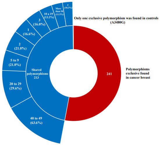 When we compared the relative frequencies of each sequence, we observed that there was a significant proportion of exclusive polymorphisms in the breast cancer cases that were practically absent in the control samples (Supplementary Materials Figure S5).