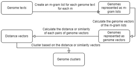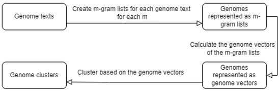 For our second experiment, we did the same thing, but instead of selecting a specific m m-gram size, we concatenated the vectors for each size, thus trying to obtain as much stored information as possible. A workflow of this second experiment can be seen in Figure 1. The workflow for the first experiment would be similar, but with only creating one m-gram list for each genome.