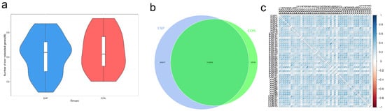 Gene number differences and correlation analysis (BLCA patients, EXP group; healthy individuals, CON group). (a) Box plot of gene number between groups. The horizontal coordinate stands for each group, and the vertical coordinate stands for the gene numbers. (b) Venn graph. Each circle represents a group. The number in overlapping circles represents the gene numbers shared between groups; the number in non-overlapping circles represents the number of genes unique to the group. (c) Sample correlation coefficient heat map. Different colors represent the level of Spearman correlation coefficient. The leftward bias of the ellipse indicates that the correlation coefficient is positive, and the rightward bias is negative.