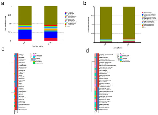 Histograms were plotted for each group, corresponding to the annotation results at genus and species levels. At the genus level (Figure 2a), the results showed Prevotella, Bacteroides, Roseburia, Bifidobacterium, Akkermansia, Megamonas, Streptococcus, Faecalibacterium, Ruminococcus, and Clostridium were the top 10 microbiomes with maximum relative abundance in two groups. At the species level (Figure 2b), the top 10 microbiomes with maximum relative abundance in the two groups were shown. On the basis of the relative abundance at different taxonomic levels, we selected the abundance information of the top 35 microbiomes in the two groups to create a heat map. At the genus level (Figure 2c), 21 microbiomes had higher abundance in the CON group, including Bifidobacterium and Lactobacillus. However, 14 microbiomes had higher abundance in the EXP group, including Streptococcus and Escherichia. At the species level (Figure 2d), 35 microbiomes in two groups under their genus were shown, which are listed in Table S1. Moreover, the heat maps also showed the phylum of these top 35 microbiomes (Actinobacteria, Bacteroidetes, Firmicutes, Proteobacteria, Verrucomicrobia).
