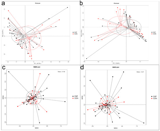 First, principal co-ordinates analysis (PCoA) was used to extract the most dominant elements and structures from multidimensional data by a series of eigenvalues and through eigenvector sorting. We performed PCoA based on Bray–Curtis distance and selected the combination of principal coordinates with the highest contribution rate for graphical presentation. As shown in Figure 3a,b, a BLCA microbial dysbiosis was revealed because overlap was found only in part with taxonomic composition in EXP and CON at genus and species level. Next, non-metric multi-dimensional scaling (NMDS) analysis was performed to overcome the shortcomings of linear models to better reflect the non-linear structure of ecological data. As shown in Figure 3c,d, there were some differences of species composition that were based on this analysis for at genus and species levels (stress points = 0.136 and 0.127, respectively). Stress points less than 0.2 indicated that NMDS analysis had reliability.