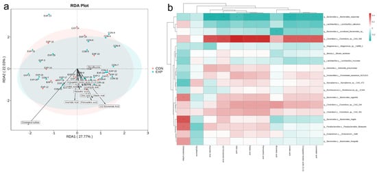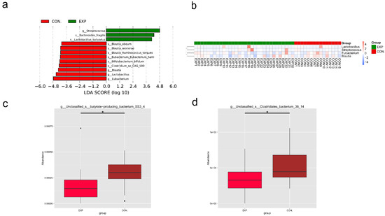 To screen for species with significant differences between groups in biomarkers, we first detected species with differences between groups by means of rank sum test and achieved dimensionality reduction by LDA (linear discriminant analysis); following this, we evaluated the effect size of the difference species. Then, the LDA score was obtained. As shown in Figure 4a, species with LDA scores greater than a set value (set to 4 by default) were revealed, which could be considered biomarkers that are statistically different between groups, including Streptococcus, Blautia, Bifidobacterium, Lactobacillus, and Eubacterium. The length of the bar chart represented the effect size of the differing species. As shown in Figure 4b, on the basis of the abundance of species that differed between groups as screened by LEfSe above, the differential species at the genus level were selected to draw a cluster heat map to reflect the distribution of these differential species across samples, including Streptococcus, Blautia, Lactobacillus, and Eubacterium. Next, we used the Metastats method to process the species abundance data between the EXP and CON groups. By correcting for the p-value, the q-value was obtained. As shown in Figure 4c,d, we found the abundance of butyrate-producing bacterium SS3_4 and Clostridiales bacterium 36_14 was significantly reduced in the EXP group compared to the CON group at the species level (q-value < 0.05).