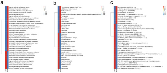 DIAMOND software (V0.9.9, https://github.com/bbuchfink/diamond/, accessed on 23 May 2022) was used to compare the unigenes with functional databases, including KEGG (Version 2018-01-01, http://www.kegg.jp/kegg/, accessed on 23 May 2022), eggNOG (Version 4.5, http://eggnogdb.embl.de/#/app/home, accessed on 23 May 2022), and CAZy (Version 201801, http://www.cazy.org/, accessed on 24 May 2022). For each sequence’s result, the Best Blast Hit was used for subsequent analysis.