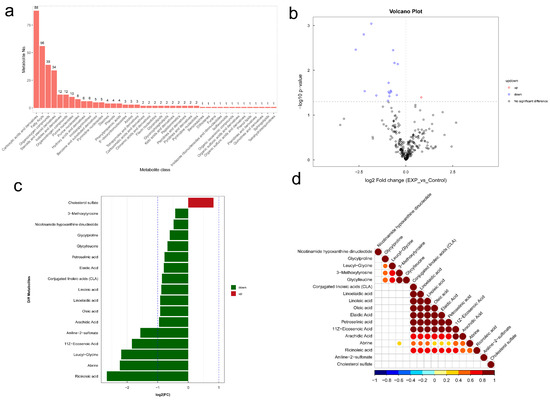 Changes of gut-microbiome-associated metabolites in BLCA patients (BLCA patients, EXP group; healthy individuals, CON group). (a) Quantitative statistics of the identified metabolites in each chemical classification. Each bar in the figure stands for a different chemical classification attribution entry. (b) Volcano plot was used to visualize the differential analysis for all metabolites detected. The horizontal coordinate was the log2 value of the fold change (FC), and the vertical coordinate was the log10 value of the significant p-value. Significantly dysregulated metabolites: metabolites meeting FC > 1, p-value < 0.05, are shown in red; metabolites meeting FC < 1, p-value < 0.05 are shown in blue. Non-significantly dysregulated metabolites are shown in black. (c) The fold change of identified metabolites with statistical significances are shown. Upregulation of differential metabolites are shown in red. Downregulation of differential metabolites are shown in green. (d) Heatmap of correlation analysis for these significantly dysregulated metabolites. Red indicates positive correlation, blue indicates negative correlation, and white indicates non-significant correlation. The size of the dot is related to the significance of the correlation.