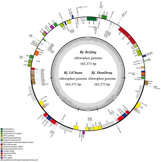 Gene map of the three R. japonica chloroplast genomes. Genes drawn inside the circle are transcribed clockwise, and genes outside are transcribed counter-clockwise. Different colors encode genes belonging to different functional groups. The area in darker gray and lighter gray in the inner circle corresponds to GC content and AT content, respectively.