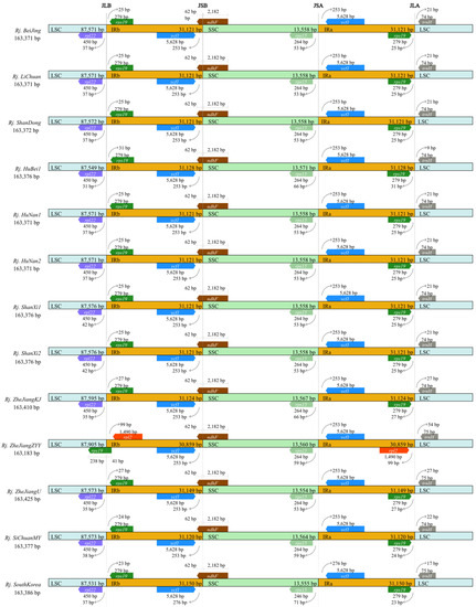 Comparison of the borders of large single-copy (LSC), small single-copy (SSC), and inverted repeat (IR) regions among the 13 R. japonica chloroplast genomes. Genes are denoted by colored boxes, and the gaps between the genes and boundaries are proportional to the distances in bps.
