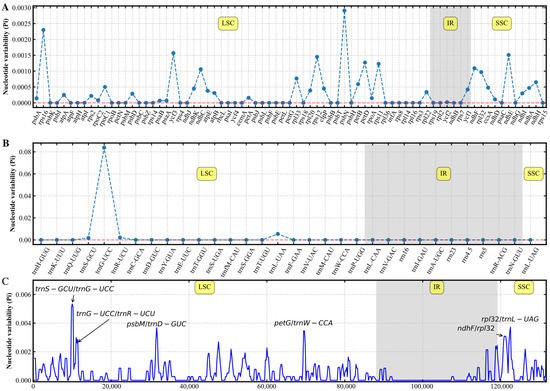 Gene nucleotide diversity (Pi) values of the 13 R. japonica. The 75 protein-coding genes (A) and 32 nonprotein-coding genes (B). X-axis, gene name; Y-axis, Pi value. (C) Six regions with the highest Pi values were masked based on alignment. Window length, 600 bp; step size, 200 bp. LSC, large single copy; IR, inverted repeats; SSC, small single copy.