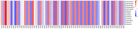 The RSCU values of all the concatenated protein-coding genes for the 13 R. japonica chloroplast genomes.
