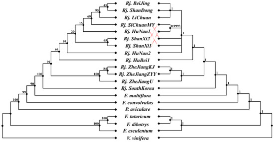 In addition to the chloroplast genomes of R. japonica from three Chinese regions obtained by us, five samples of R. japonica were provided by [23], and another five chloroplast genomes data were obtained from the NCBI (Accession: NC_059800.1, MW411186.1, MT955361.1, MK381448.1, and MT301955.1). F. multiflora (MK330002.1), Fagopyrum dibotrys (MF491390.1), Fagopyrum tataricum (KM201427.1), Fagopyrum esculentum (EU254477.1), Fallopia convolvulus (OK0409957.1), Polygonum aviculare (NC_058892.1), and Vitis vinifera (NC_007957.1) were used as an outgroup to root the phylogenetic tree.