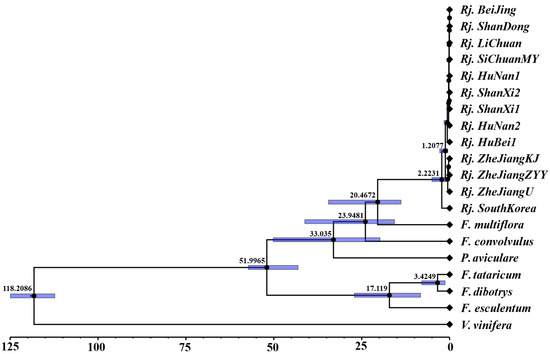 Divergence times of R. japonica and other plants based on shared protein-coding genes with three priors. The mean divergence times of the nodes are shown next to the nodes, and the blue bars correspond to the 95% highest posterior density (HPD); X-axis unit, million years ago (MYA).