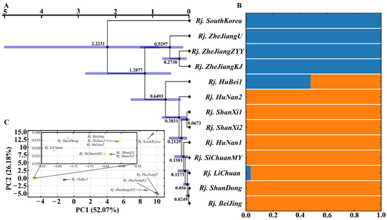 Intraspecific diversity and genetic structure of R. japonica based on whole chloroplast genomes: (A) phylogenetic tree; (B) population structure analysis with K = 2; (C) principal component analysis.