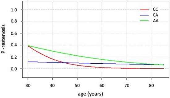 The interpretation of the model is as follows: in individuals with the CA genotype, the risk of restenosis remains almost the same at any age. In contrast, in individuals with the CC genotype and AA genotype, the risk decreases over time. The risk of restenosis is about ten times higher in younger individuals with the CC genotype compared with those with the CA genotype, while at the age of 45, this difference diminishes. Differences in restenosis occurrence between those with the CC or CA genotype compared with the AA genotype was statistically insignificant.