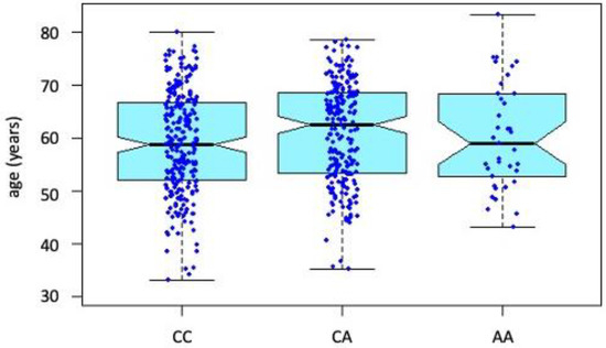 At first glance, it may look like there is a difference in the survival function between the CC and CA genotypes. However, due to the above-described differences in age between the genotypes at the year of the selective coronarography, risk proportionality was verified using Cox proportional hazards modeling. As shown in Figure 3, individuals with the CA genotype are globally older than those with the other genotypes.