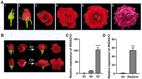 Effects of age and ethylene on rose phenotype. (A) Different flower opening stages of rose flowers. Six developmental stages of rose were divided into stage 1, pigmented bud with partially opened sepals; stage 2, bud with fully opened sepals; stage 3, flower with loose outermost petals; stage 4, flower with completely unfolded petals; stage 5, fully opened flower; and stage 6, flower with senesced petals. (B) Representative rose flowers after air or ethylene (Eth) treatment for 24 h. (C,D) Expression of RhSAG12 during flower opening (C) and after ethylene treatment (D). RhUBI2 was used as reference gene. Values are reported as mean ± SE (n ≥ 3). Student’s t-test, *** p < 0.001, **** p < 0.0001.).