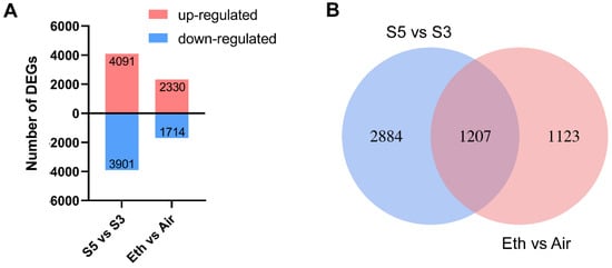 Comparison of development-dependent and ethylene-regulated genes in rose petals. (A) Numbers of differentially expressed genes (DEGs) at developmental stages and after ethylene treatment. DEGs were determined using fold changes ≥ 2 and p-value < 0.05. (B) Venn diagram of upregulated DEGs in groups representing stage 3 (S3), stage 5 (S5), and ethylene-treated petals (Eth).